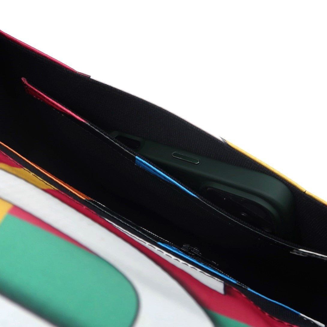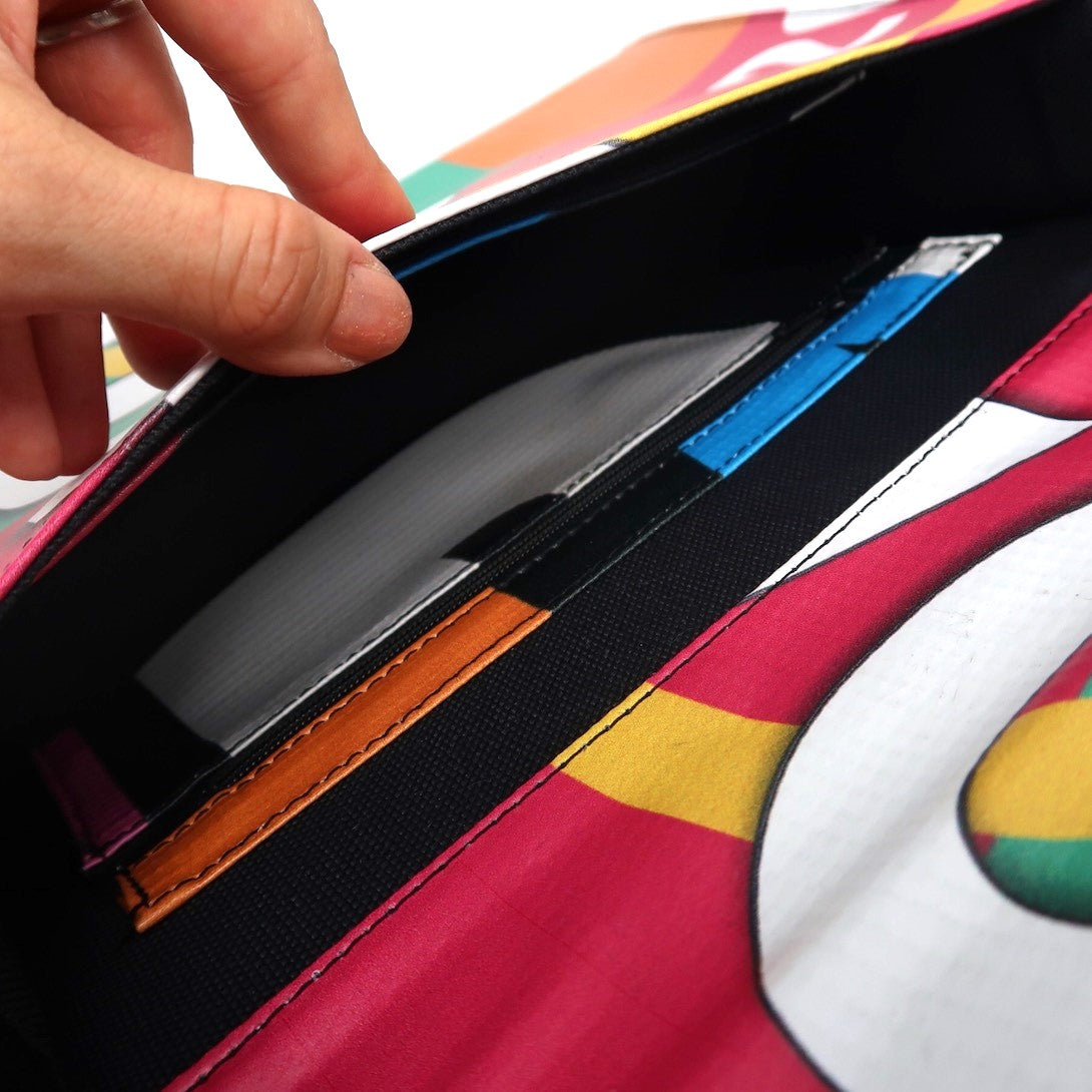 Kelly es bolso de mano fabricado de carteles de publicidad.